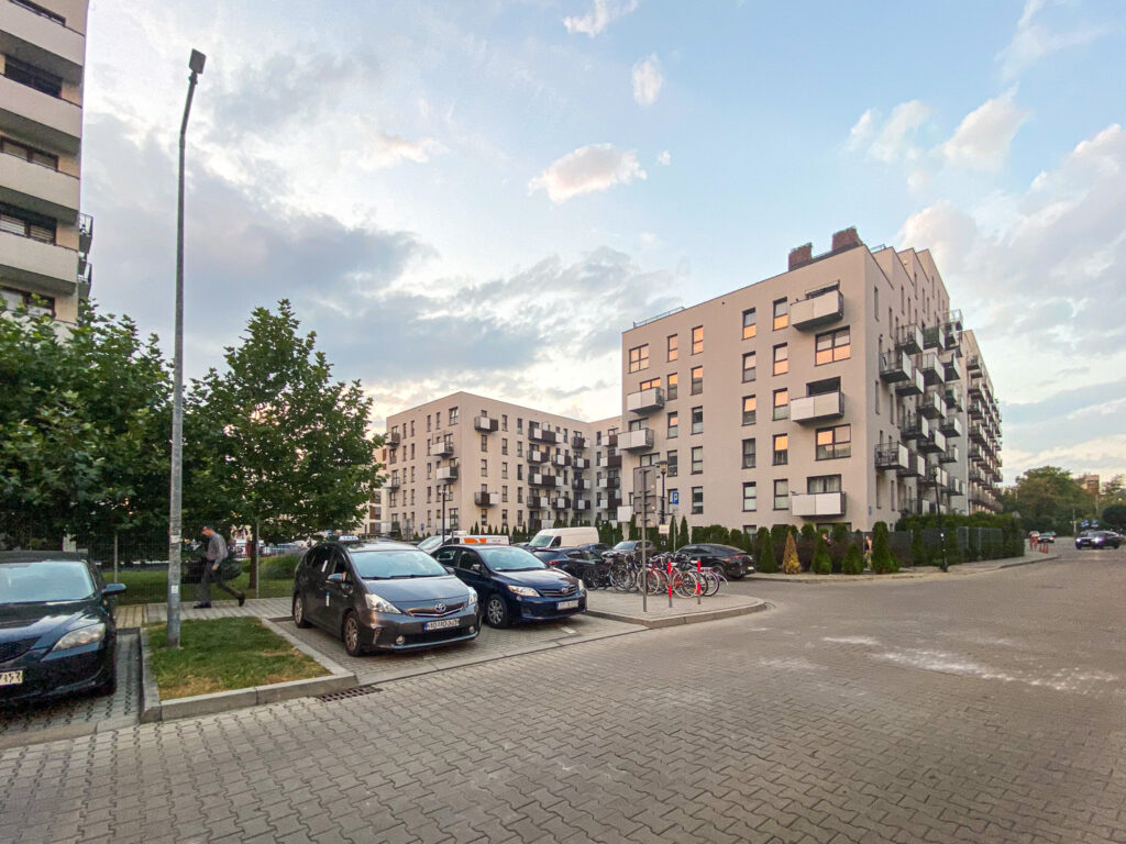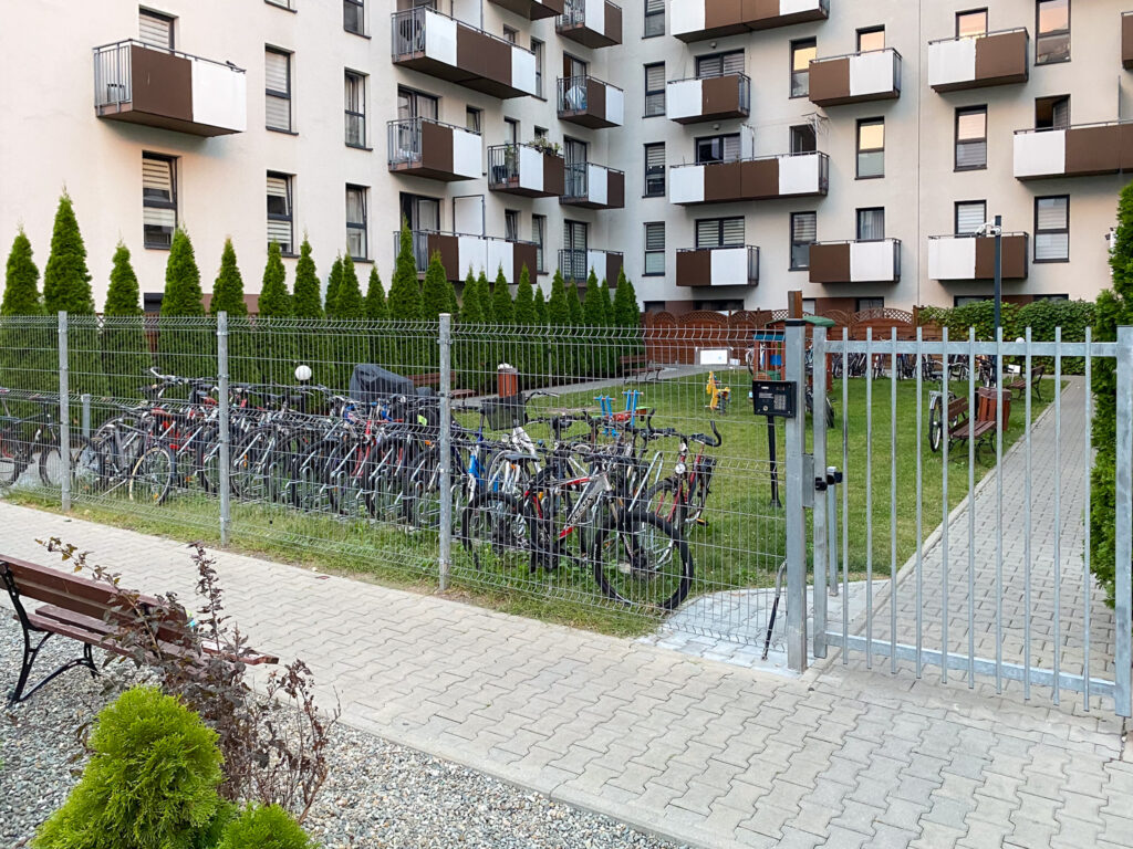 Widok z zewnątrz, parking rowerowy na terenie zamkniętym, winda: